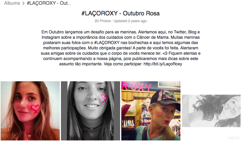 Pensando em Outubro Rosa, criamos a campanha #LaçoRoxy para promover a conscientização dos cuidados de prevenção que as mulheres devem ter referente ao câncer de mama. Na campanha, as meninas deveriam fazer um laço rosa da bochecha e compartilhar a foto com a hashtag. Continuar lendo “Campanha #LaçoRoxy – Outubro Rosa”